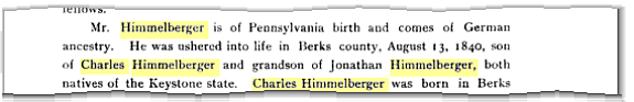 Info 84: Franklin R. Himmelberger, the well known carriage and wagon builder of the borough of West Reading, was born near Centre township, Berks county, Feb. 5, 1861, son of Daniel P. and Rebecca (Richard) Himmelberger.