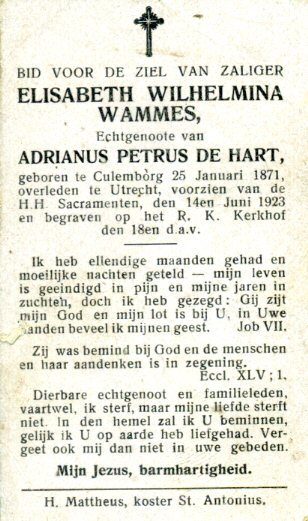 74. Bernardus 'Nars' Wammes, geboren 29 Apr 1878 in Redichem, overleden 5 Nov 1918 in Culemborg, landbouwer. Hij overleed aan de Spaanse griep. Hij trouwde 5 Nov 1906 in Culemborg, Johanna van den Ham, geboren 27 Nov 1886 in Culemborg, (dochter van Jan van den Ham en Cornelia van Wiggen) overleden 21 Mrt 1968 in Culemborg. Na het overlijden van Nars bleef dochter Cornelia bij Johanna, maar de jongens moesten naar een weeshuis. Kinderen: