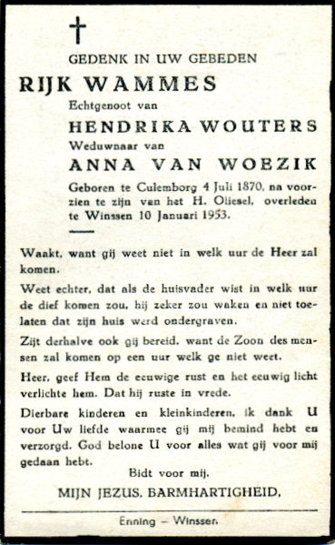 80. Rijk Wammes, geboren 4 Jul 1870 in Culemborg, 1894 landbouwer, overleden 10 Jan 1953 in Winssen, koopman (in fruit), schipper. Hij trouwde (1) 5 Apr 1894 in Culemborg, Anna van Woesik, ook bekend als Anna van Woezik, geboren 16 Jan 1866 in Ewijk, (dochter van Hendrik van Woesik en Willemina van Wolfferen) overleden 6 Jan 1925 in Ewijk. Anna bracht een schip mee uit haar 1e huwelijk met Willem van Gaalen. Hij trouwde (2) Hendrika Wouters, geboren 21 Mrt 1876 in Horssen, (dochter van Willem Wouters en Jacoba Weeren) overleden 16 Feb 1951 in Dreumel. Kinderen van Anna van Woesik: